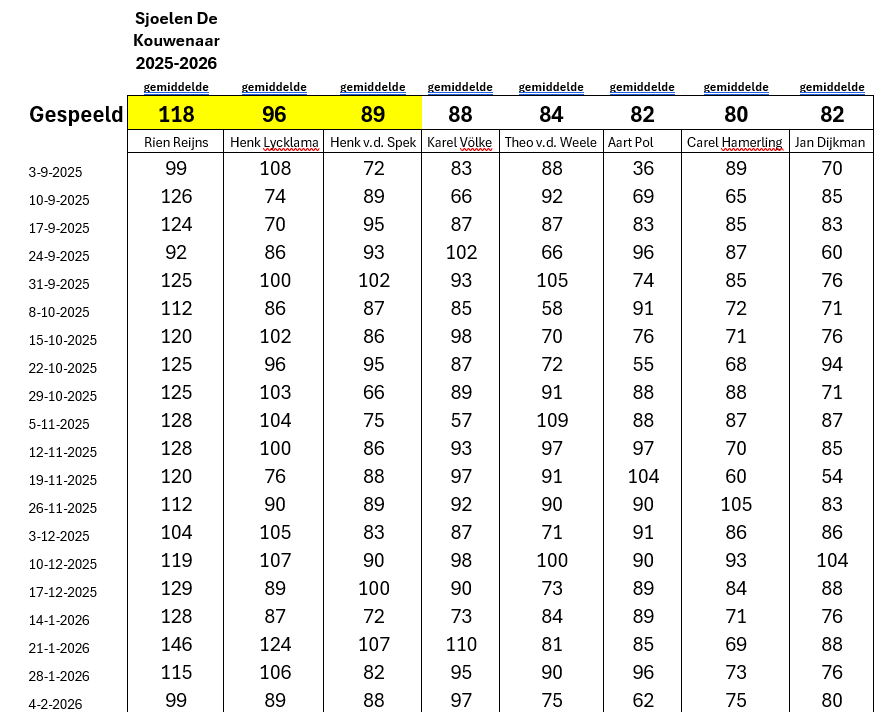 De Kouwenaar sjoelen: Stand en resultaten 25 februari 2026