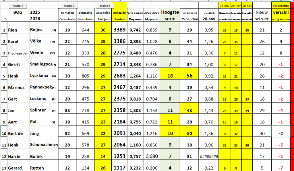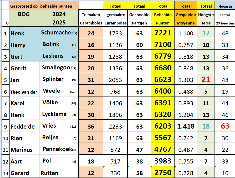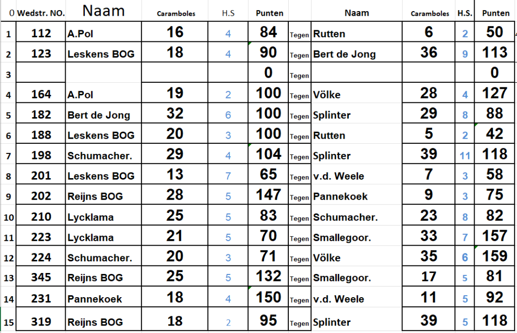 Standen en uitslagen van de Biljartvereniging B.O.G. Vaassen